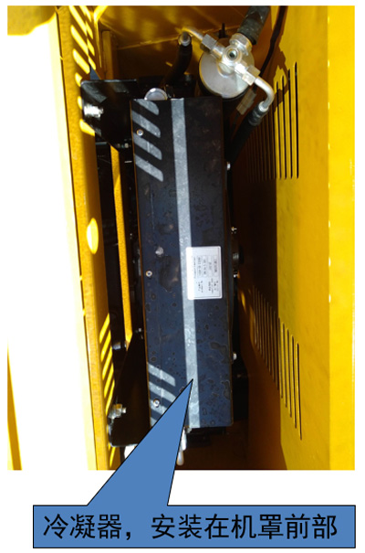 检查冷凝器表面及冷凝器与发动机水箱之间(停机检查)是否有碎片、杂物、泥污,并进行清理和用水清洗。冷凝器可用长毛刷沾水轻轻刷洗,千万不要用高压水冲洗。装载机在煤场、木材场、土方等环境,经常导致冷凝器散热片堵塞,要求冷凝器表面经常清洗。检查冷凝器表面有无脱漆,注意及时补漆,以免锈蚀。检查冷凝器表面及管接头处(包括储液器接头处)有无油迹,若有,判断是否有制冷剂泄漏。沿着制冷剂流动的方向,用手摸着,若同一管道存在明显温差,此处存在堵塞,也可通过歧管压力表,若表压指示高压高或极高,说明高压管道有堵塞。