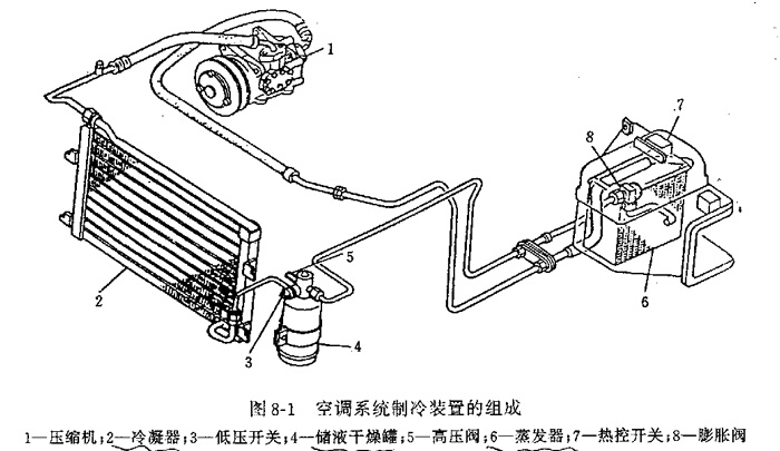 1-电磁离合器及压缩机2-冷凝器3-低压开关4-储液干燥器5-低压阀6-减压蒸馏器7-热控电源开关8-膨涨阀