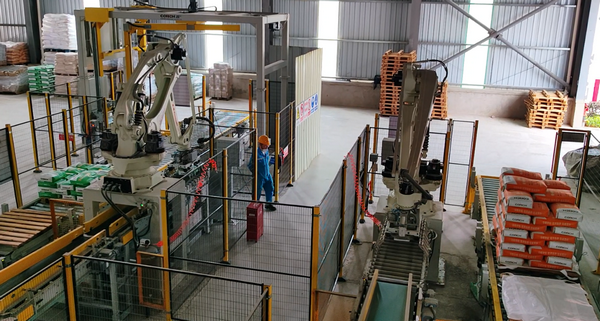 根据客户需求选配自动包装机,对成品料进行阀口袋或敞口袋包装,包装速度快、计量准确。包装好的成品料通过输送带有序输送至码垛系统进行码垛,实现全流程智慧管控。